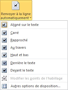 Pour habiller une image avec du texte, cliquez dessus et ouvrez le menu Format sous Outils Image. Sous Renvoyer à la ligne automatiquement cliquez sur Rapproché.